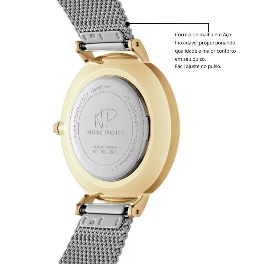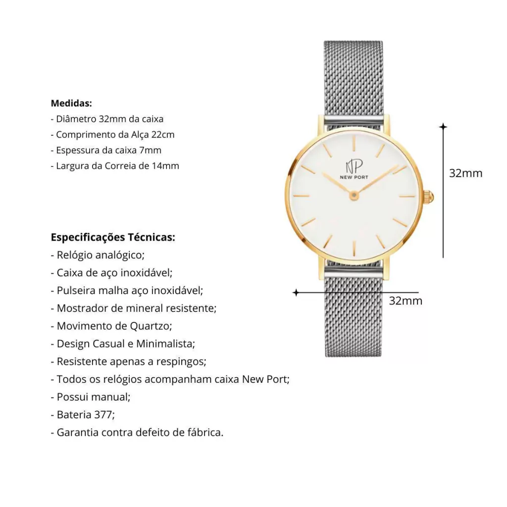 O Kit apresenta o Relógio Feminino New Port Madeleine Dourado Pulseira Prata, destacando-se pelo vidro de mineral de alta resistência. Complementando-o, o clássico bracelete dourado em aço inoxidável foi meticulosamente desenhado para espelhar a cativante beleza dos nossos relógios casuais minimalistas.