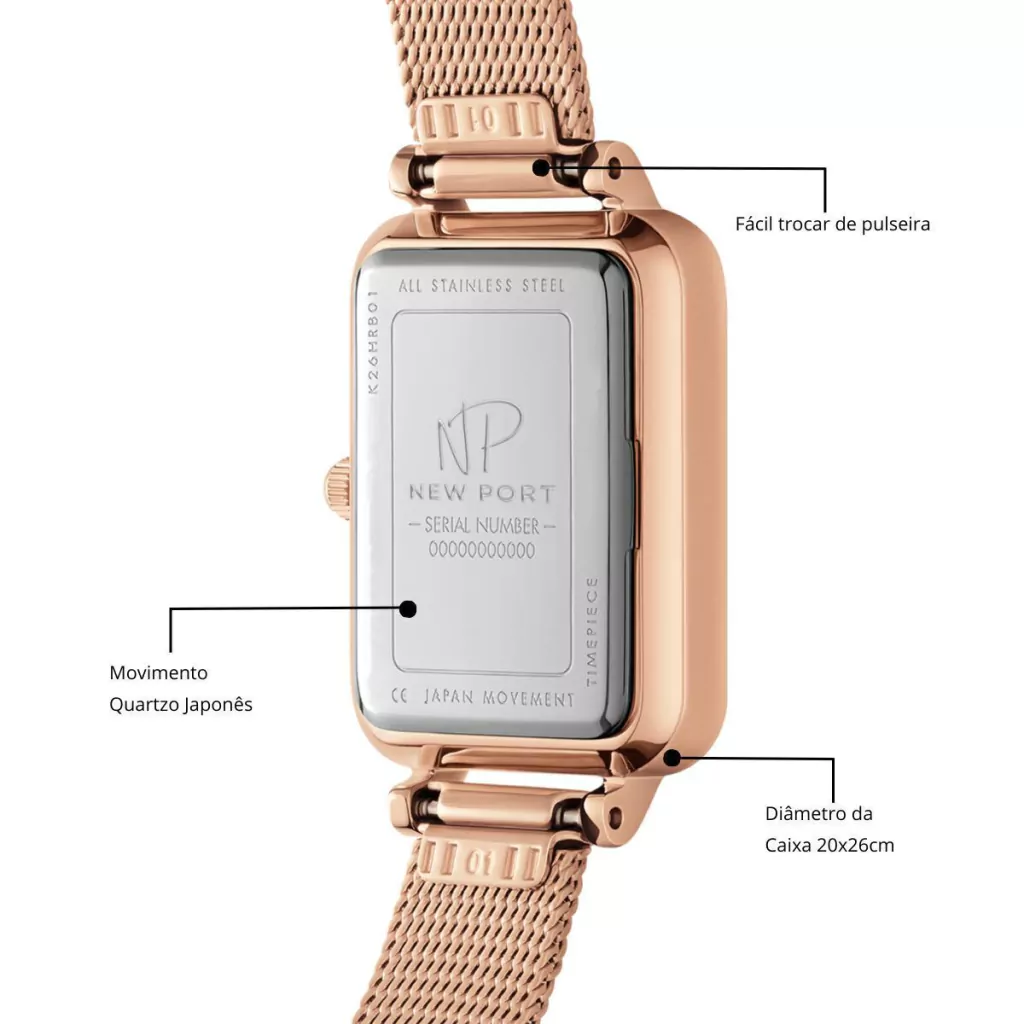 O Relógio Feminino New Port Quadrado Vermont Rosé, acompanhado por uma pulseira de aço inoxidável rosé, exibe proporções de 20x26mm. A caixa é confeccionada em metal rosé, enriquecendo a combinação com um mostrador branco protegido por um vidro de mineral endurecido.